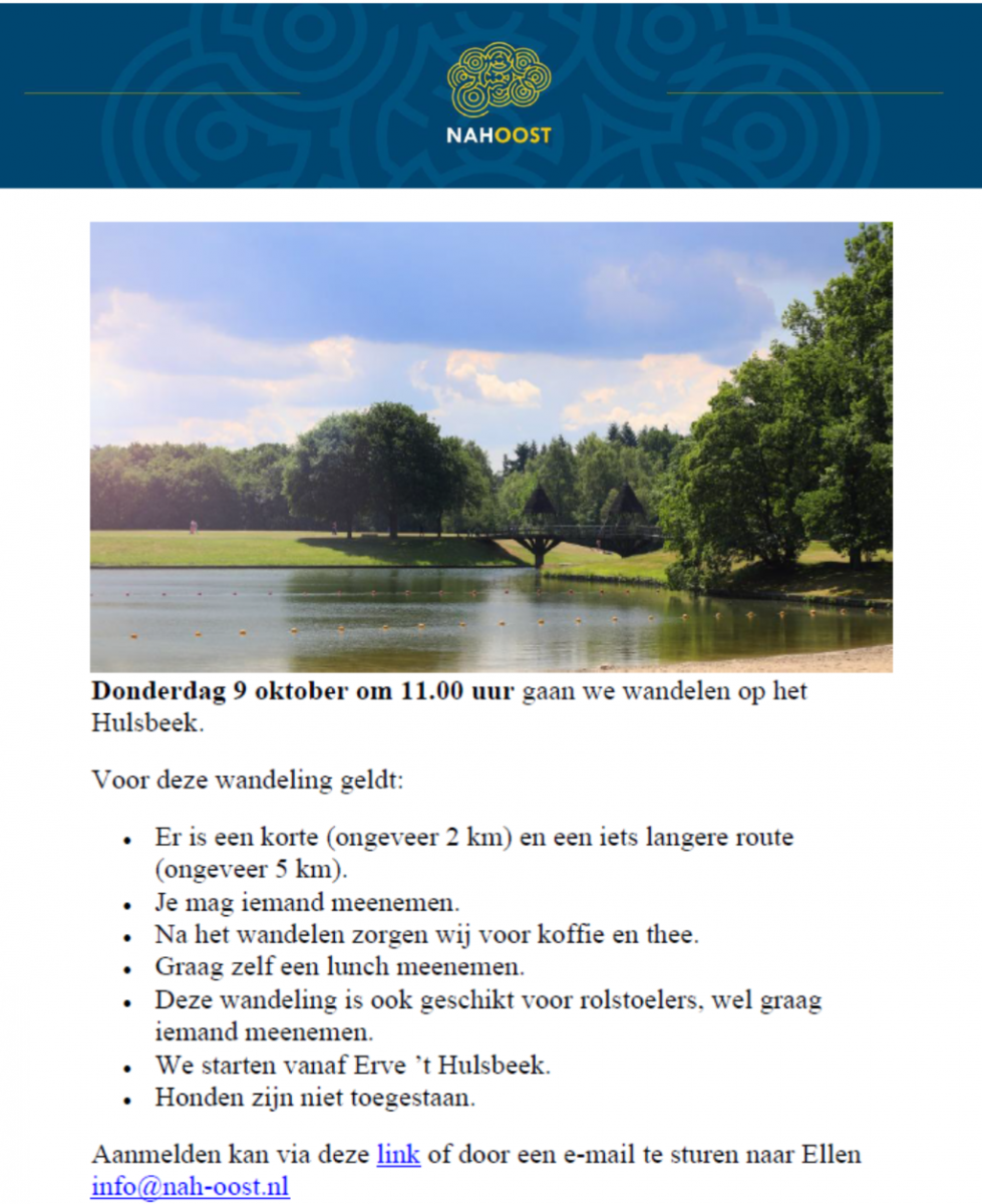 NAH Oost organiseert weer een gezellige wandeling op donderdag 9 oktober 2025. Deze keer gaan ze wandelen op het Hulsbeek. Ze starten om 11.00 uur vanaf Erve ’t Hulsbeek. Deze wandeling is ook geschikt voor rolstoelers! Aanmelden kan via deze link of door een e-mail te sturen naar Ellen: info@nah-oost.nl.