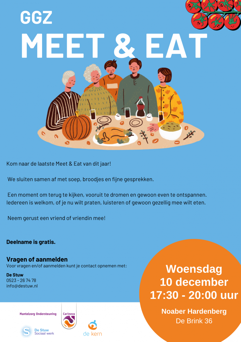 De Meet & Eat is op woensdag 10 december 2025, van 17.30 – 20.00 uur. De locatie is Noaber Hardenberg, aan de Brink 36, 7771 BB in Hardenberg. Deelname is gratis. Neem gerust iemand mee! Voor vragen en/of aanmelden kun je contact opnemen met: info@destuw.nl.