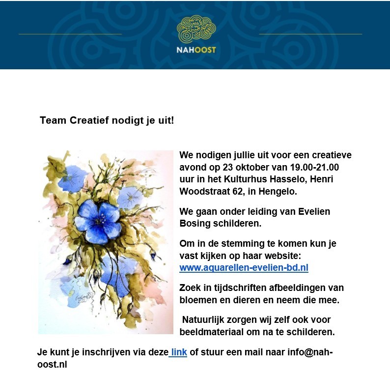 Team Creatief van NAH Oost organiseert een creatieve avond op donderdag 23 oktober 2025 van 19.00-21.00 uur in het Kulturhus Hasselo, Henri Woodstraat 62, in Hengelo. We gaan onder leiding van Evelien Bosing schilderen. Om in de stemming te komen kun je vast kijken op haar website: www.aquarellen-evelien-bd.nl. Je kunt je inschrijven via deze link of stuur een mail naar info@nah-oost.nl.