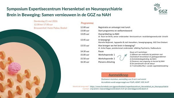 Op donderdag 21 mei 2026 organiseert het Expertisecentrum Hersenletsel en Neuropsychiatrie van GGZ Oost-Brabant het symposium ‘Brein in Beweging: Samen vernieuwen in de GGZ na NAH’. Samen verkennen de deelnemers hoe we binnen de GGZ kunnen blijven vernieuwen en verbeteren voor mensen met NAH.