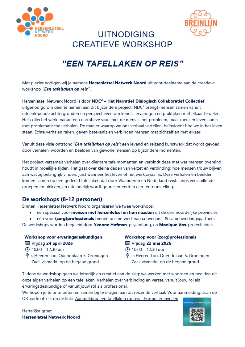 Eén voor ervaringsdeskundigen en/of mensen met hersenletsel en hun naasten, uit de drie noordelijke provincies, op vrijdag 24 april 2026, van 10.00-12.30 uur.