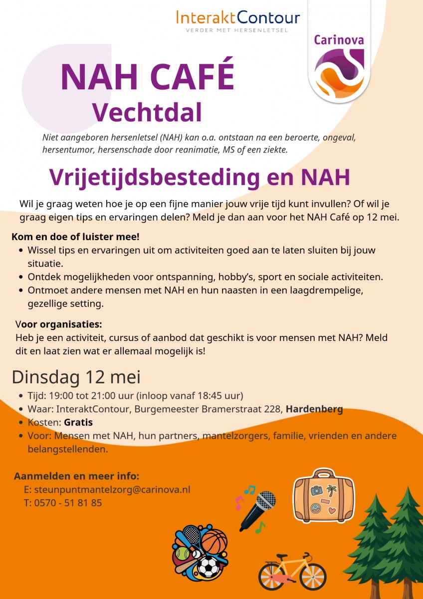 Het NAH Café is op dinsdag 12 mei 2026, 19.00 – 21.00 uur. De locatie is InteraktContour, Burgemeester Bramerstraat 228 in Hardenberg. Meedoen is gratis. Aanmelden doe je door een e-mail te sturen aan steunpuntmantelzorg@carinova.nl.