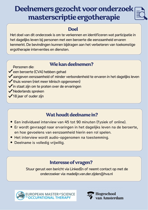 Deelname aan dit onderzoek bestaat uit één individueel interview (fysiek of online). Ken je iemand die mogelijk wil deelnemen? Of ben je zelf geïnteresseerd? Stuur gerust een bericht via LinkedIn of e-mail naar madelijn.van.der.zijden@hva.nl.