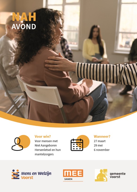 Er zijn weer avonden voor mensen met NAH en hun mantelzorgers uit de gemeente Voorst. De avonden worden georganiseerd door Mens en Welzijn, MEE Samen en gemeente Voorst. Tijdens de avonden kun je mensen ontmoeten die hetzelfde hebben meegemaakt, informatie rondom NAH vergaren en ervaringen en verhalen delen.