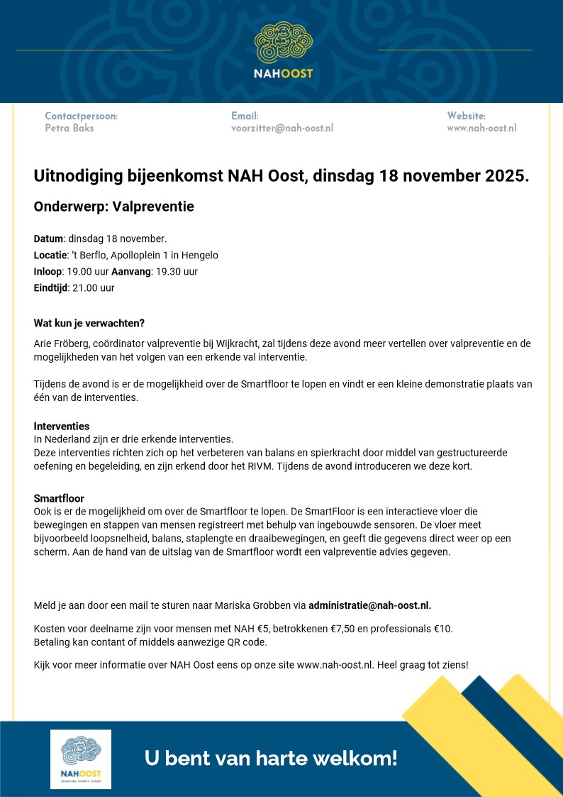 NAH Oost organiseert een bijeenkomst op dinsdag 18 november 2025 met het thema ‘valpreventie’. Gastspreker Arie Fröberg vertelt van alles over valpreventie en wat je kan doen om het risico op vallen te verkleinen. Ook kun je zelf een Smartfloor proberen.
